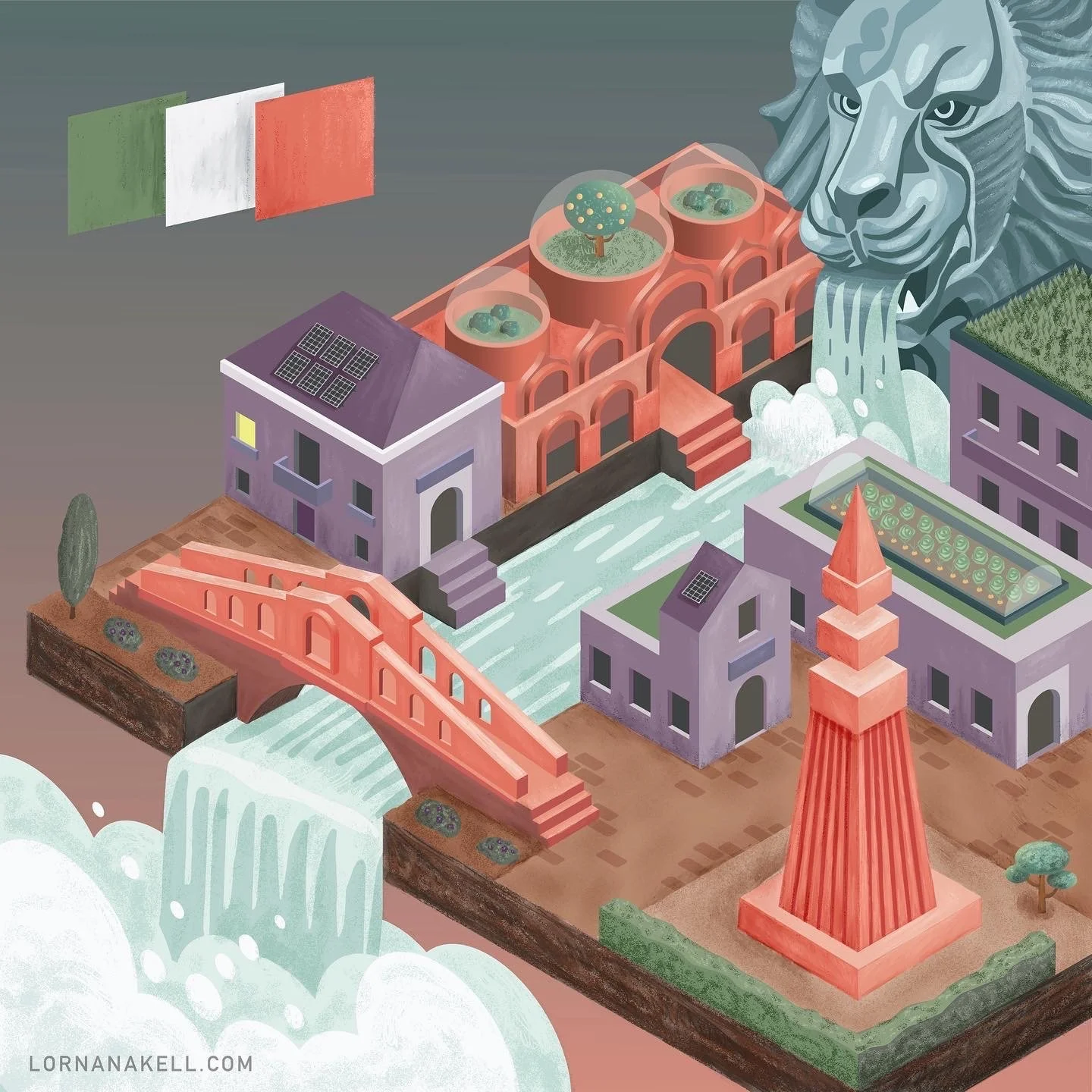 For the Illustration for Motion class I created an isometric future, fantasy Venice, Italy incorporating three major landmarks (Basilica de San Marco, Piazza San Marco, and Ponte de Rialto) and a typically seen lion-head fountain design to help convey the location.